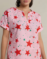Our Pink Stardust Slit Neck Top and Shorts print bursts with vibrant tropical florals and a striking toucan motif, bringing a lively escape to your loungewear.