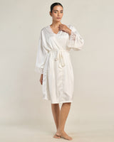 An ode to ease and elegance — our Satin Short Robe drapes beautifully with its above-the-knee length, wide sleeves, and tie waist. Ideal for relaxed mornings or quiet moments of indulgence.